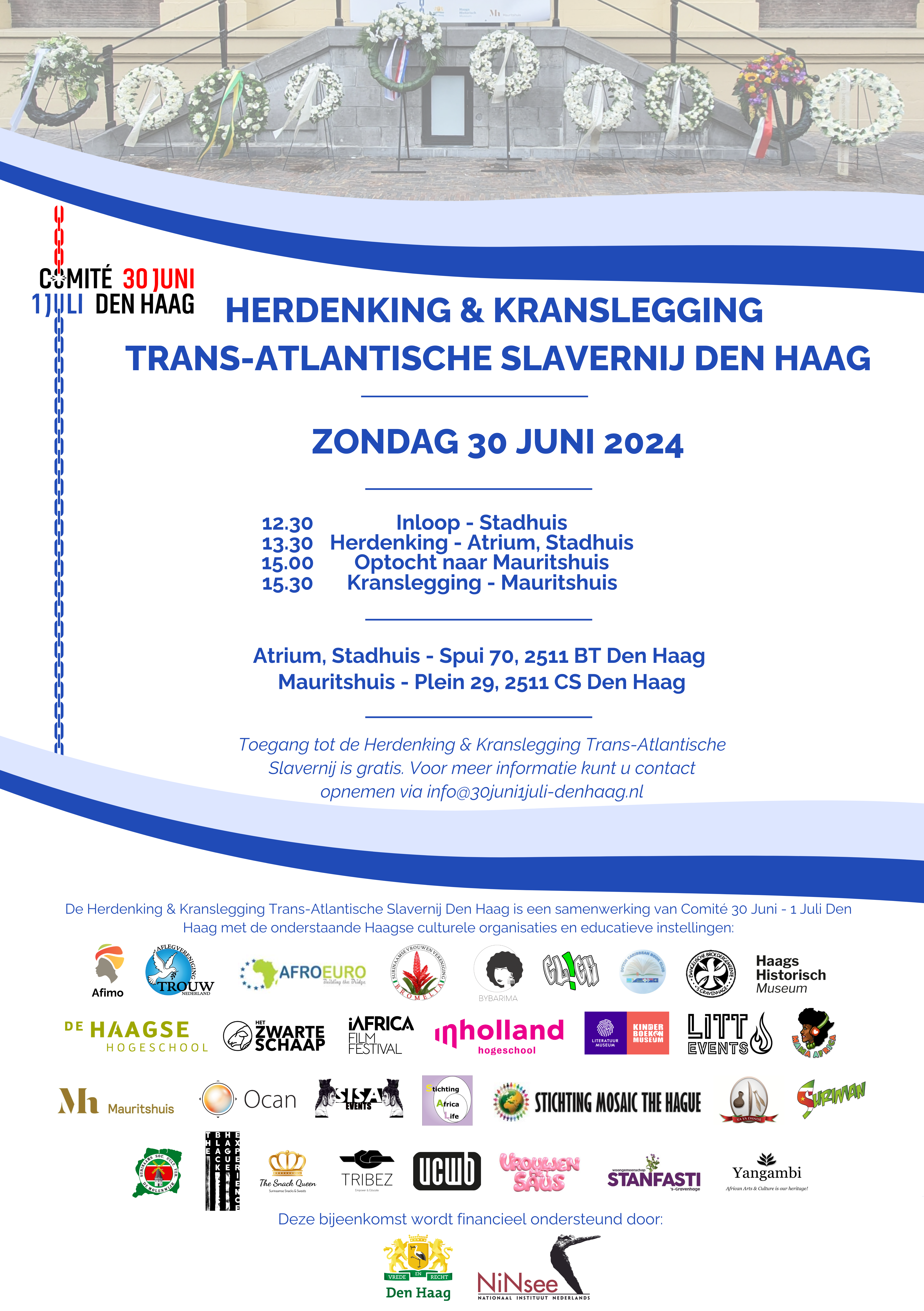 De Herdenking & Kranslegging Trans-Atlantische Slavernij is een bijeenkomst waarbij de gemeenschap eer betoont aan de slachtoffers van deze gruwelijke periode. Het programma omvat verschillende sprekers die zullen reflecteren op de lessen die we kunnen leren uit deze geschiedenis en haar voortdurende doorwerking, gebaseerd op het jaarlijkse thema. Naast de toespraken zullen nazaten van de Trans-Atlantische slavernij ook optredens verzorgen, zowel individueel als in culturele ensembles. Na de herdenking leidt een korte culturele optocht onder militaire begeleiding, ons naar de plaats waar de kranslegging zal plaatsvinden. Totdat het Haagse monument ter nagedachtenis aan de Trans-Atlantische slavernij onthuld wordt, vindt de kranslegging plaats op de binnenplaats van het Mauritshuis.